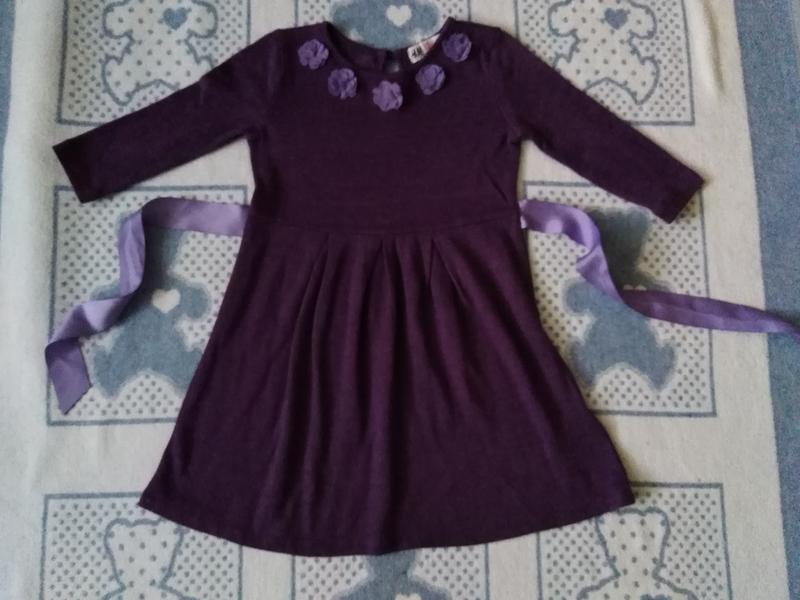 Плаття для дівчинки фіолетового кольору. Бренд H&M, розмір 98/104, 2-4 роки. Спереду оздоблене квіточками. Недолік на фото 4. Довжина - 55 см. Ширина плечей - 23 см. Ширина в поясі - 27 см. Довжина до талії - 22 см. Довжина рукава від плеча - 27 см.