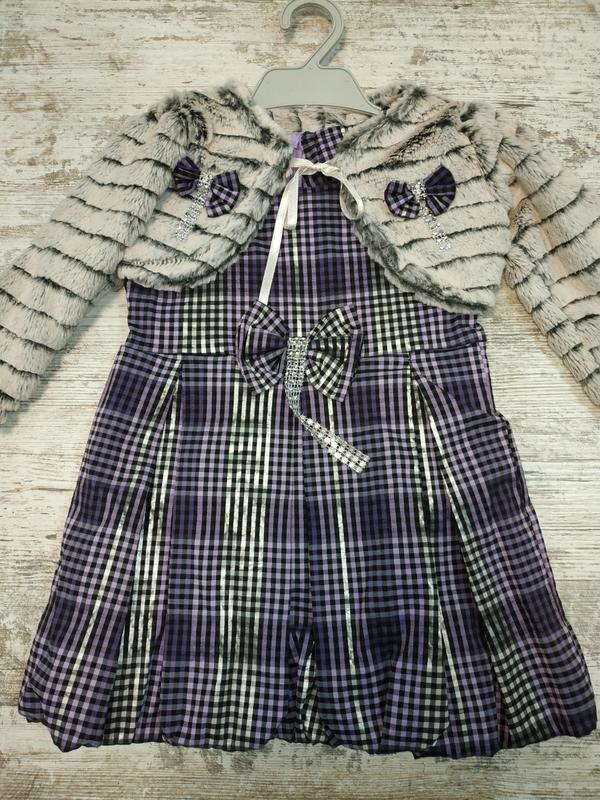 Сукня абсолютно нове,подарували і так і не встигли одягнути,в комплекті болеро хутряне,в сукні є підкладка,ззаду блискавка. Виглядає дуже ошатно,на бирочке зазначений ріст 92,два роки,заміри:загальна довжина 44см,талія 54см пройма 12см,рукав-28 см
