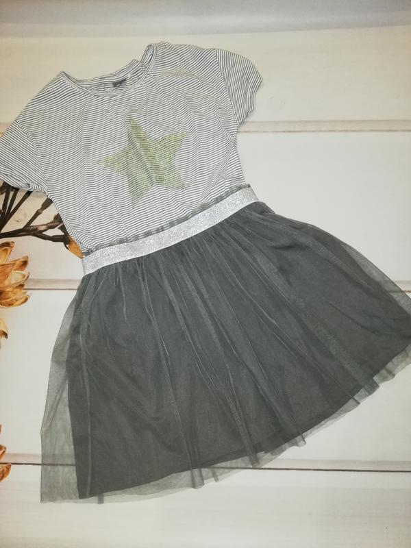 Платье Некст. Верх- футболочный коттон, низ- коттон, сверху фатин. Пояс- резинка серебро. Спереди принт- глиттерная звездочка. В идеале, размер 146, 10-11 лет.