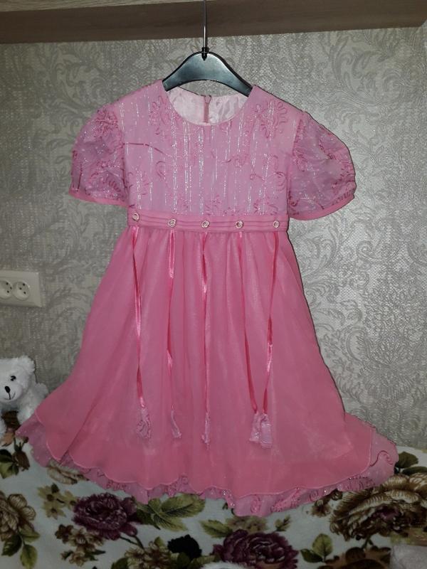 Нарядное розовое платьице на девочку, состояние отличное. Длина 66, плечо 9, в груди 30.