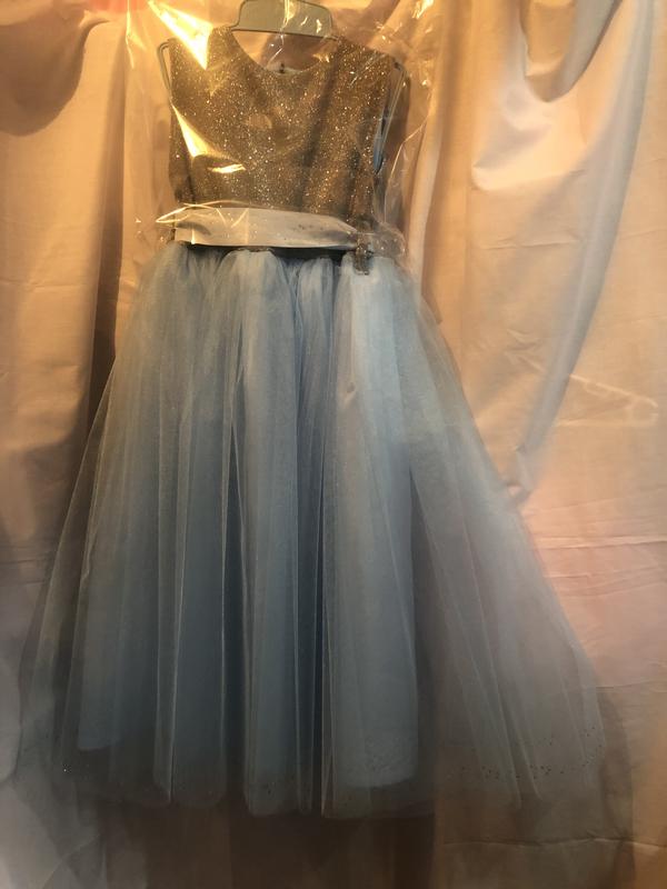 Сукня голуба. Ліф з срібної тканини. Підклад натуральний. По спинці блискавка. Пояс ,низ юбки і під‘юбника прикрашений камінням сваровскі. Сукня для принцеси. Дуже гарна і святкова. Ціна від 250 до 550гр. 80,86,92-250 гр. 98-300гр. 104-350 гр. 110-400 гр. 116-450 гр. 122-500 гр. 128-550гр