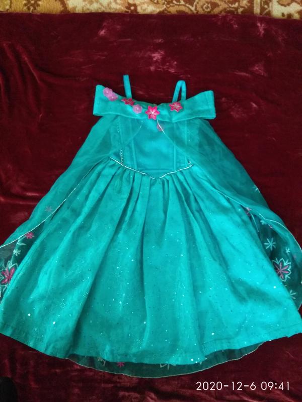 Размер 30-32, длина платья 77 см( от плеча к н за юбки). Полу/ ок/груди 27 см; полу/ок/талии 28 см; спинка на молнии, талия регулируется шнуровкой с двух сторон. На бирке на 3 года, но нужно ориентироваться по ребенку.