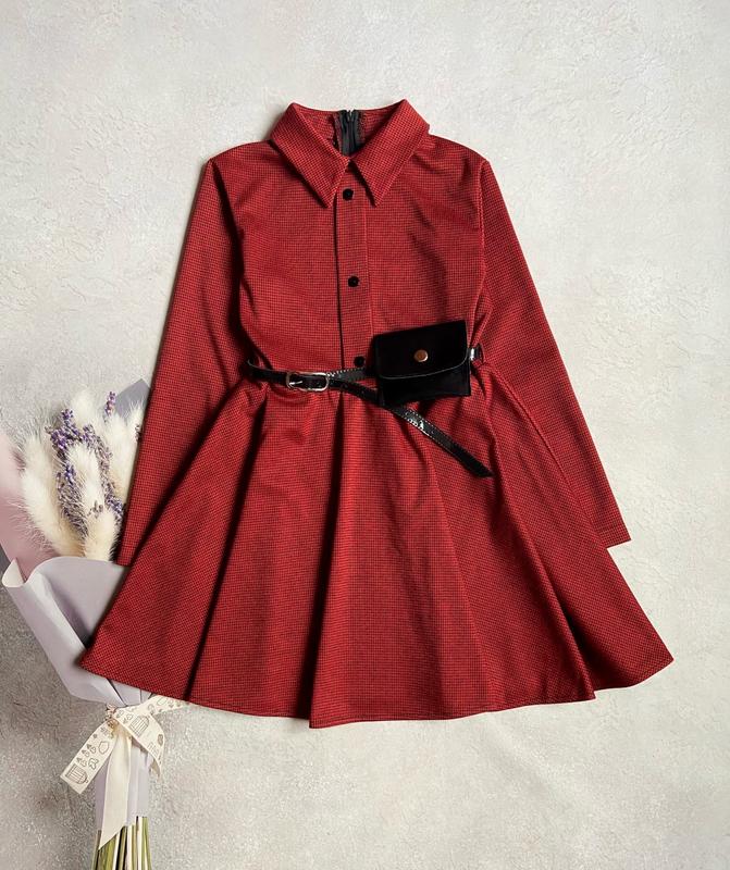 Очаровательное стильное платье - разлетаечка с плотного трикотажа. Сзади молния. Спереди пуговички для красоты. Поясок с сумочкой в комплекте. Качество огонь!!! Рекомендую! Цвет красное с черным. Замеры: 134 - длина 61, талия 33, рукав 42 - 1 шт. 140 - длина 67, талия 34, рукав 47 - 1 шт. 146 - длина 71, талия 36, рукав 49 - 1 шт. 152 - длина 78, талия 40, рукав 52 - 1 шт.каштан