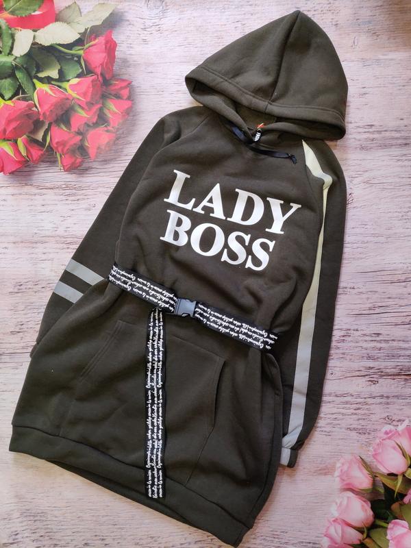 Бесподобное тёплое платье в стиле оверсайз с кармашками кенгуру.Светоорожаюшие лампасы цвет -хаки Замеры: длина\длина рукава от горловины 152 рост -80\64