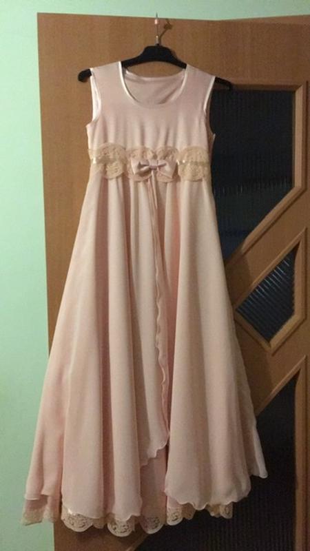 Платье нарядное на девочку на рост приблизительно 143-150см . Нежно пудровый цвет . Одето один раз ( шили на выпускной в 4 классе).