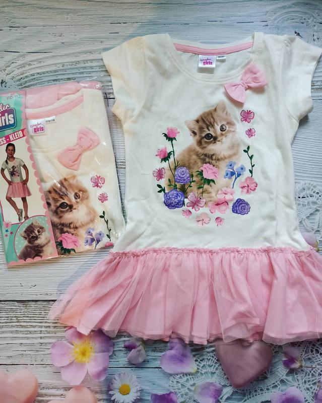 Платье на девочку 4-6 лет на рост 110/116 см. Платье с котенком. Фатиновая юбка, очень красиво смотрится 😍 Очень красиво смотрится😍 Замеры Дл 60,4 Пог 31 Плечи 24,5