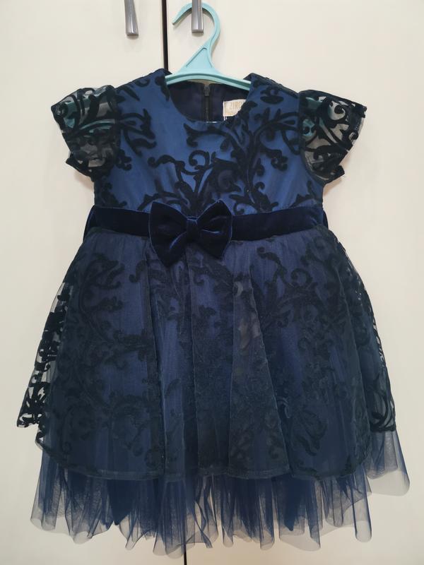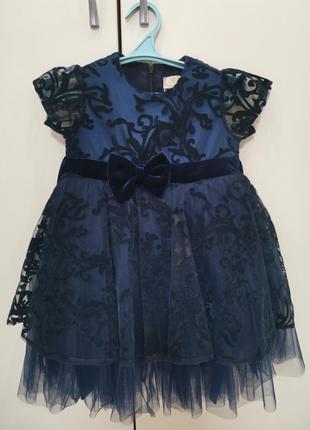 Платье с подкладкой из фатина, сверху велюровые узоры. Темно-синего цвета, на рост 98-104 см. Сзади завязывается на бант. Подкладка платья полностью хлопковая, так что будет ребенку приятно его носить. Смотрится очень шикарно. Можно на подарок, бирки сохранены.