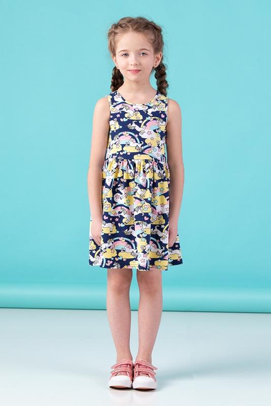 Легкий, летний сарафан для девочки. Модель приталенная. От линии талии слегка присобрано, свободного кроя. Модель полностью запринтована ярким узором. Модель не стесняет движения. Выполнена из мягкого кулира - натуральной эластичной ткани. Подойдет для прогулок в жару или на пляж. Сочетайте с любой летней обувью: мокасинами, босоножками, сланцами. Сарафан 98 104 110 116 Обхват груди 52 52 54 54 Ширина в плечах 20 20 21 22 22 Длина изделия 49 53 56 59