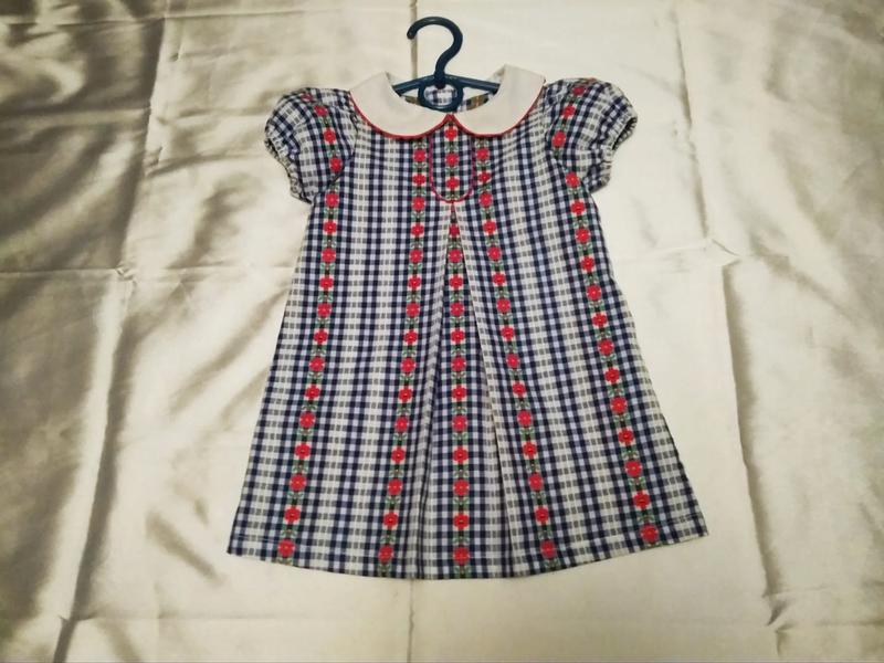 Дитяче платтячко нове в біло-синю клітинку й вишиті квіти. Застібається на спинці на гудзики. Розмір 92 на дівчинку віком 1-1.5 роки. Довжина 46 см, по грудях 27 cм. Тканина натуральна бавовна. Стиль ретро.