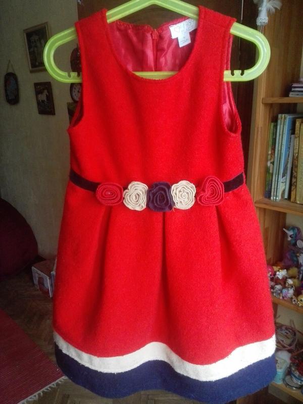 Очень красивый, очень тёплый,нарядный и повседневный сарафан. Приятного ярко-красного цвета, внизу светло- бежевая и темно- синяя полоски. Украшен цветочками из такого же материала,из которого пошит и сам. Текст о составе вшит в шов,поэтому могу сказать примерно о составе: очень похоже на то,что в ткани есть шерстяная нить. Сарафан из плотной ткани,есть подкладка. Сзади есть молния. Фирма children place . Размер 5т( мы одевали и в 4, и в 6). Сарафан не заношен,состояние отличное Длина 65 см,полуобхват груди 31см