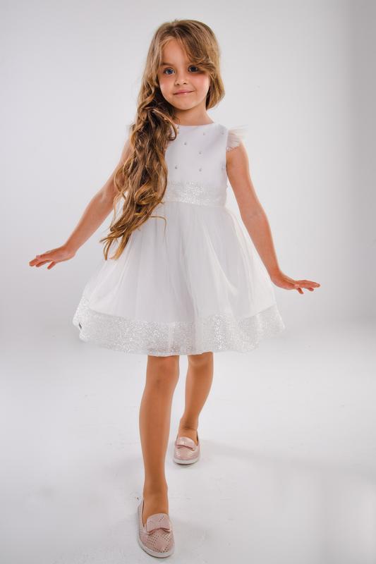 Праздничное роскошное платье для настоящих принцесс: верх украшен сеткой с жемчужинами, юбка – фатином, создающим великолепие платья. На талии яркий акцент в виде блестящего пояса, такая же ткань по низу юбочки. Оригинальная спинка с вырезом в виде сердца, пояс сзади завязывается на бант из фатина. Нежные крылышки на плечах. Платье на мягкой подкладке, поэтому девочке будет приятно находиться в платье длительное время. Размеры: 98, 110 Состав: 100% полиэстер; подкладка: 70% полиэстер, 30% вискоза. Замеры: 98 - длина 54см, ширина 28см 110 – длина 58см, ширина 30см