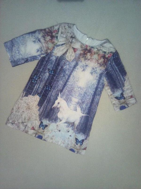 Шикарное платье с Единорогом на модницу,рассчитано на 4 года.Красивая расцветка.Сзади молния.Рукав идёт по типу 3/4.Без дефектов. Замеры по запросу