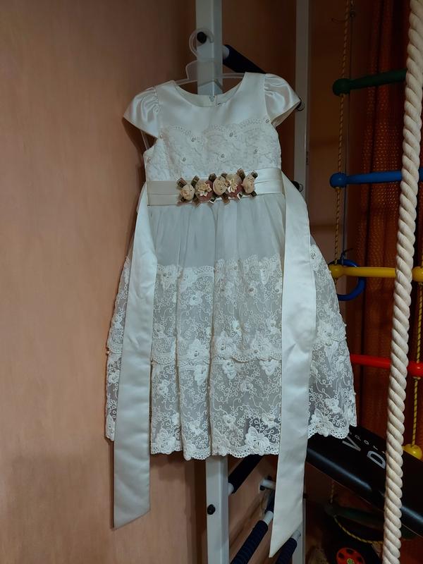 в живу ще шикарніше, ніж на фото. плаття було одягнено один раз на день народження до 5 років) без будь-яких дефектів, після свята я його не прала, так як не бачу в цьому необхідності. підійде для жінки 3-4 -5 років , ззаду на блискавці, пояс утягивается під ваш розмір. все в намистинках стразах, кольорах, верх і пояс атлас. подьюпников багато , до тіла хб. колір максимально передало перше фото. маля буде чарівна!!!!!