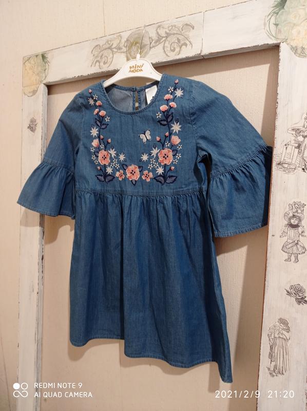 Джинсовое платье с вышивкой, интересными рукавами и завышенной талией. 122 см. Замеры ПОГ 35, плечи 28, рукав 3/4, длина 65. Одевали пару раз.