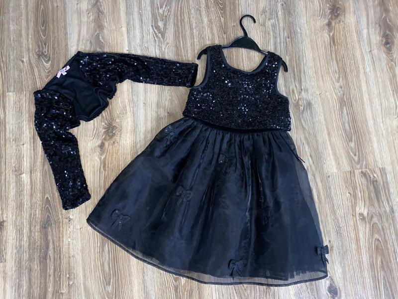 Суперское, нарядное, вечернее пышное платье Верх паетки, сзади шикарный бант на кнопках, юбка пышная слой организм с бантиками, слой фатин с рюшами и подкладочка!!! Длина 72см ПОГ 32см Длина юбки 44см Болеро полностью паетки 7-8л Длина 19см Рукав укорочён 39см Все в состоянии новой вещи!!!! Без зацепок, цвет не застиран!!!! Отправлю укрпочтой и новой почтой! Джастин не отправляю!!! Обмена и возврата нет!