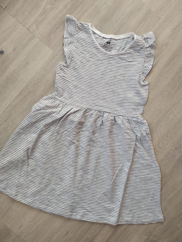 Платье из мягкого трикотажа из органического хлопка с развевающимися рукавами фирмы Н&М. Эластичный шов на талии с декоративными сборками. Отличный вариант для жаркого лета! Состав: Хлопок 100% Размер: 4-6 лет на рост 110/116см ПОГ - 31см, ширина между плечами - 22см, длина платья от плеча - 62см
