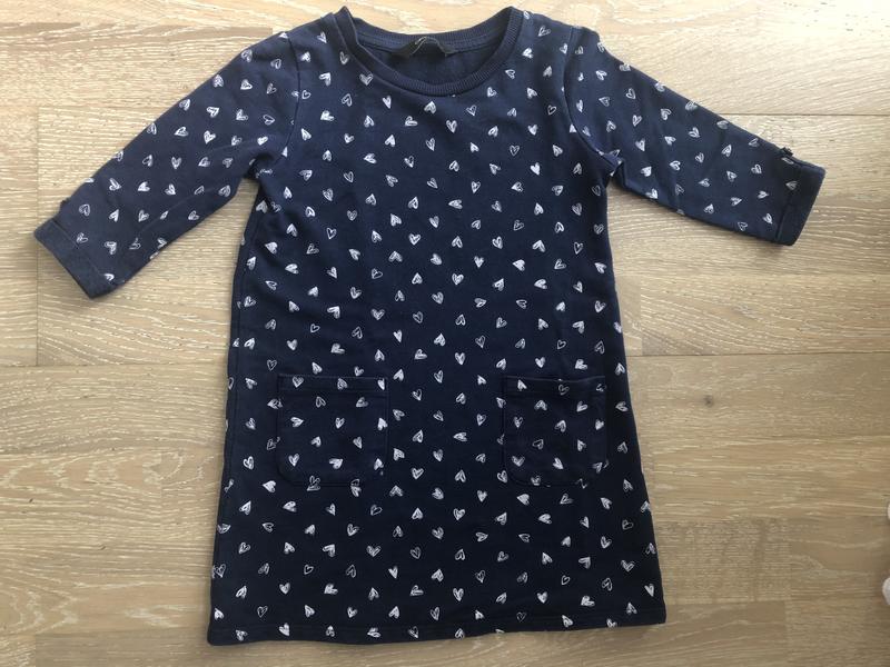 Плаття синього кольору в сердечка. Розмір 2-3 роки. Спереду має 2 кишеньки. Без плям та пошкоджень. Одягали декілька раз