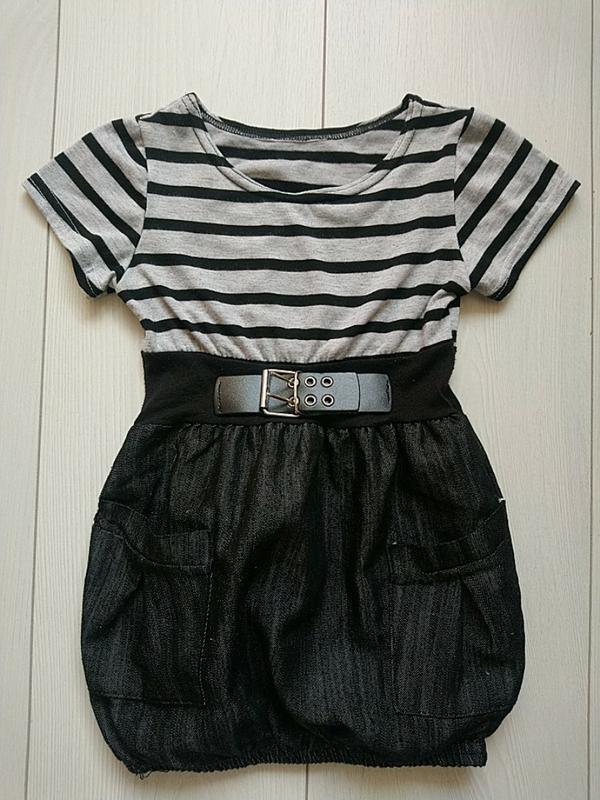 Плаття в дуже хорошому стані Верх трикотаж, спідничка джинсова Довжина 46 см В плечах 23 см Під руками 26 см Півобсяг пояса 22 см Пояс еластичний Матеріал 95% віскоза і 5 % еластан