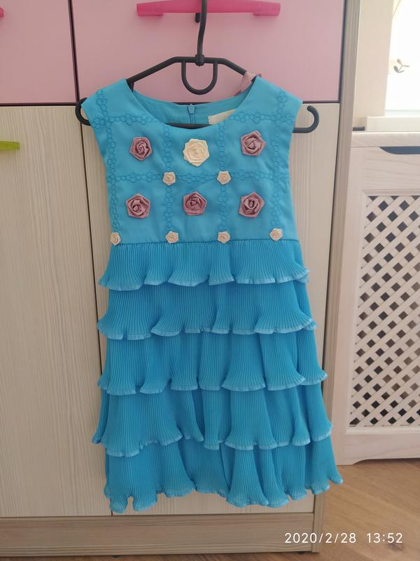 Святкова сукня для дівчинки 5-7 років на зріст 122-128. В ідеальному стані. Моя дочка вдягала 2 рази на свято в садок і день народження. Колір - насичено-блакитний, оздоблена рожевими квітками. Підклад натуральний - бавовна. Довжина до коліна, в ній дитині зручно рухатися. Заміри: ПОГ - 35, довж. по спинці - 62 см.
