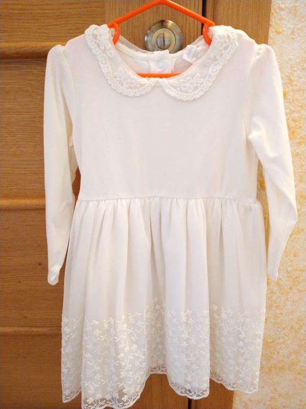 Нарядное платье для девочки. Размер 1,5-2 года, реально на 2 года. Материал - хлопок, фатиновая юбка сверху и фатиновый воротник. Очень красивое. Цвет: молочный.