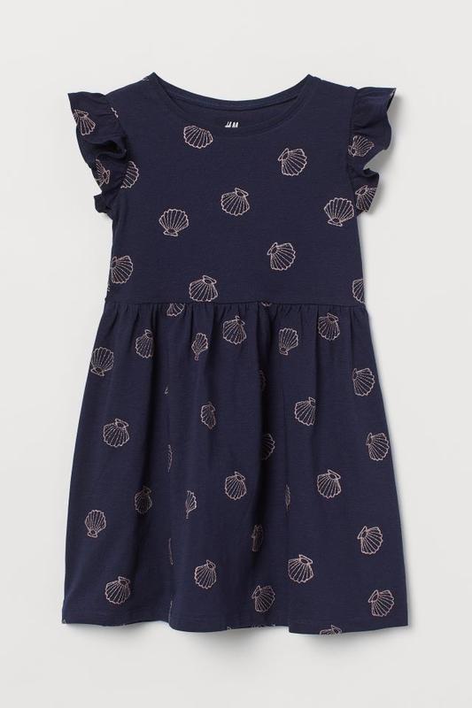 Классное летнее платьице H&M (Германия) Отличное качество по отличной цене! Платье из мягкого трикотажа из органического хлопка. Рукава с оборками и отрезная талия на резинке, с декоративной сборкой. Цвет: темно-синий/ракушки. Состав: 100% хлопок. Размеры в наличии: 98/104, 110/116, 122/128, 134/140. Цена окончательная!
