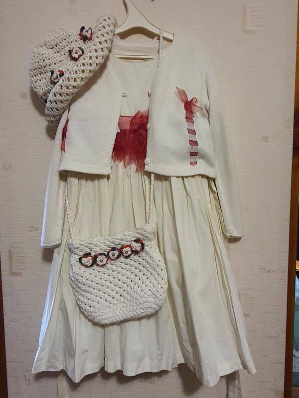 нарядный эксклюзивный комплект для девочки. дорогой и качественный бренд платье на хб подкладке. после глажки юбка очень пышная. сзади на молнии. впереди капроновые банты украшения, сзади пояс завязывается в бант длина 70, по груди 31. цвет шампань болеро машинная вязка впереди на 3 пуговички длина 30, рукав 41, плечи 30, по груди 32 плетёная сумочка 19×17 на длинной верёвке Панама окружность 54 см без нюнсов. было куплено на тематическое мероприятие. в идеале