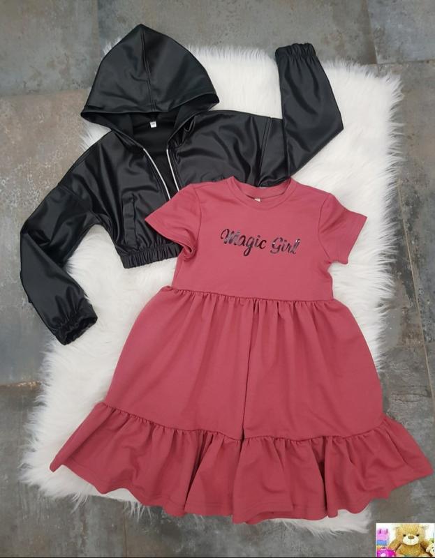 Крутой наборчик для стильных модниц!! Трикотажное платье+бомбер из экокожи! ЗАМЕРЫ: р. 98-104 - платье длина 53 см, пог 30 см, бомбер длина 27 см, рукав от шеи 47 см р. 110 - платье длина 56 см, пог 31 см, бомбер длина 28 см, рукав от шеи 49 см р. 116 - платье длина 60 см, пог 32 см, бомбер длина 29 см, рукав от шеи 55 см р. 122 - платье длина 62 см, пог 33 см, бомбер длина 30 см, рукав от шеи 56 см р. 128 - платье длина 66 см, пог 34 см, бомбер длина 31 см, рукав от шеи 58 см р. 134 - платье длина 70 см, пог 35 см, бомбер 32 длина см, рукав от шеи 60 см Склад ОДЕЖДА