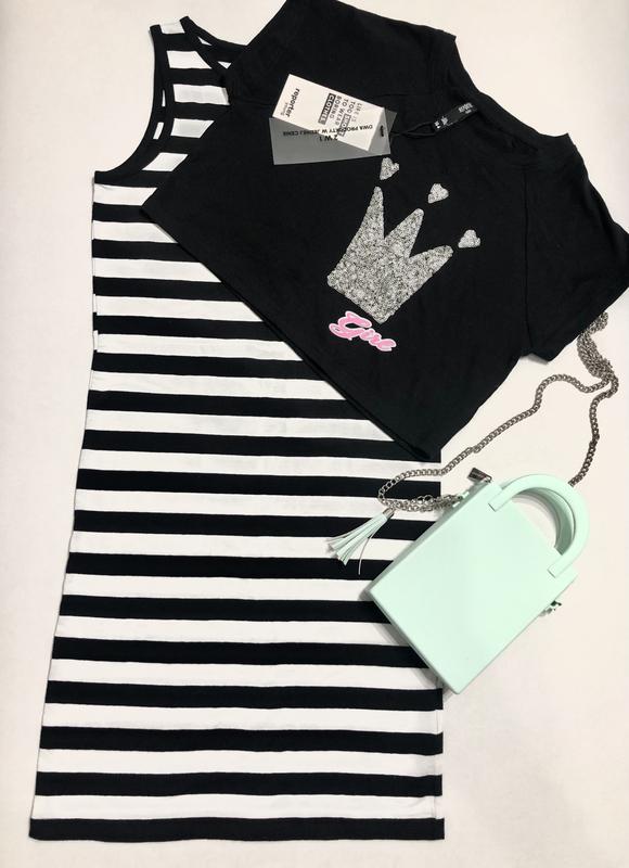 Красивое стильное котоновое платье в чёрно -белую полоску с чёрной укороченной футболкой с короной с серебристых паеток и яркой розовой надписью,можно носить отдельно,очень круто смотрится и очень удобное,польский известный производитель,размер 164