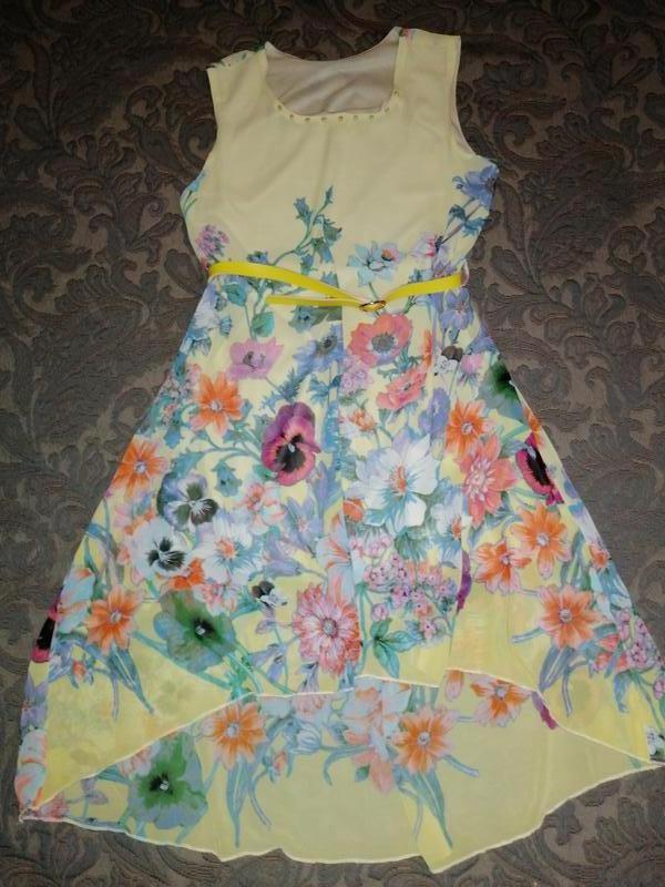 Платье для девочки р.140-152/10-12.без рукавов Верх - нежно-желтый шифон в цветочный принт. Подкладка- трикотаж, полиэстер. Красивый, легкий, расширяется к низу. Можно с пояском. Перед короче спинки. Замеры: Длина по спинке- 92 см Перед длина от плеча- 75 см Обхват груди- 78-80 см