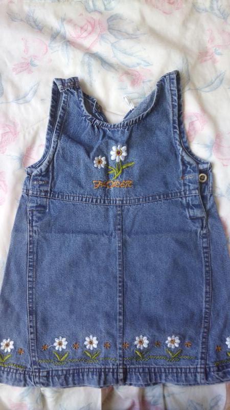Джинсовий сарафанчик. ПОГ 29 см, ПОБ 35 Плечі 24 см, довжина 49 см, на останніх фото видно дефект, розпоролось по шву.