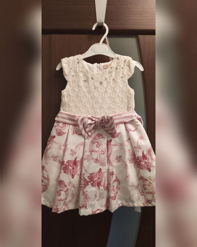 Красивое платье на принцессу. Одето один раз. Состояние нового пдатья. Снизу фатин и хлопковая подкладка. Сзади есть завязки, бант с завязками снимается. Можно брать на 2 года. Турция. Размер 98. Замеры: ширина 25,5 см, длина 49 см.