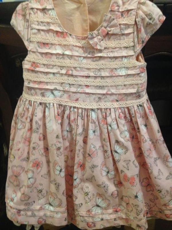 Дуже красиве нарядне бавовняне плаття ніжно рожевого кольору ( на фото виглядає блідіше колір). Прикрашена мереживом. Низ плаття пишний за рахунок подьюпника двох'ярусного. Брали на рік . Розмір вказаний на ріст 80см, (замовляли на оф. сайті), одягли один раз на свято. В ідеальному стані. Виміри: від пахви до пахви-28см, по талії -30см, довжина ззаду по спинці-42 см