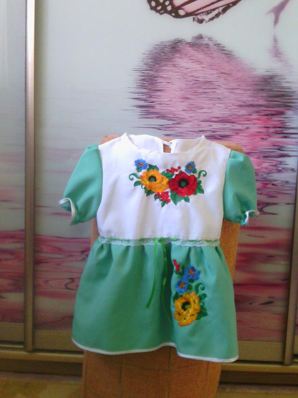 Платье детское вышитое.Ширина изделия в талии 32 см.Длина изделия 45 см.Длина рукава 17,5 см.Ширина между проймами 27 см.