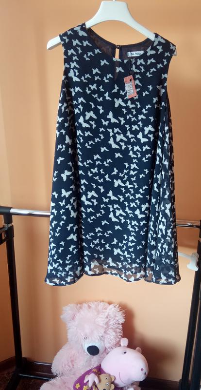 Новое, с этикеткой, цвет темно синий, ближе к черному. Платье свободное, пышное, ткань шифон, внутри с подкладкой. Очень приятная на ощупь, мягкая ткань. Замеры: длина по спинке от шеи до низа 62 см ширина под руками 36 см ширина по плечам 27 см.