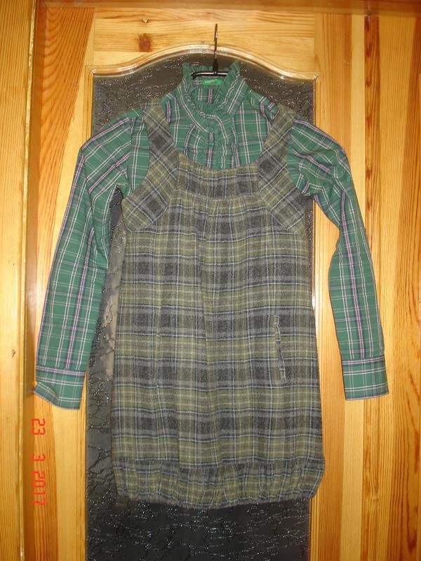 Стильный, фирменный сарафанчик-туничка ( в зависимости от роста ребёнка), из полушерстяной ткани в клеточку, полностью на подкладке, с двумя действующими карманами и застёжкой-молнией сбоку. Фасончик очень удобный, мягкая резиночка по низу, не даёт сарафанчику "подскакивать" во время активных движений. Отличный вариант на прохладную погоду, в школу, на мероприятие. Состояние б.у. без замечаний. Указан размер 9-10 лет, рост 140 см, пр-во Морокко. Замеры: ПОГ - 39 см, ПОБ -52 см, полная длина от верха шлейки - 71 см. Отлично смотрится с блузкой Benetton, тоже продаётся ( плечи -33 см, длина рукава -56 см, ПОГ - 41 см, длина по спинке -53 см-120 грн., состояние -идеальное б.у.