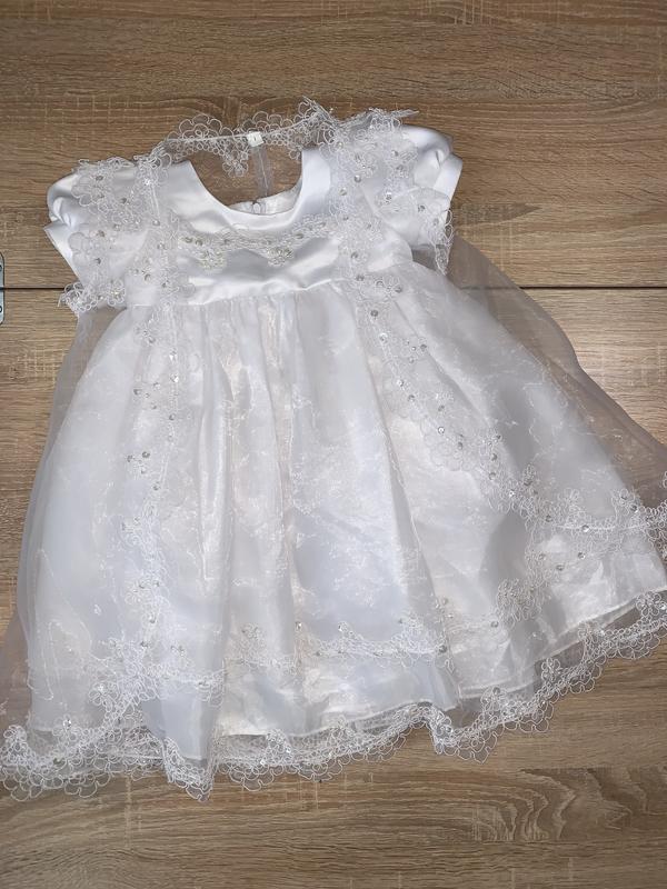 Очень красивое нежное платице с накидкой ! Накидку можно снять Но малышка в нем смотрится настоящей принцессой ) Очень пышное , состояние идеальное без дефектов !