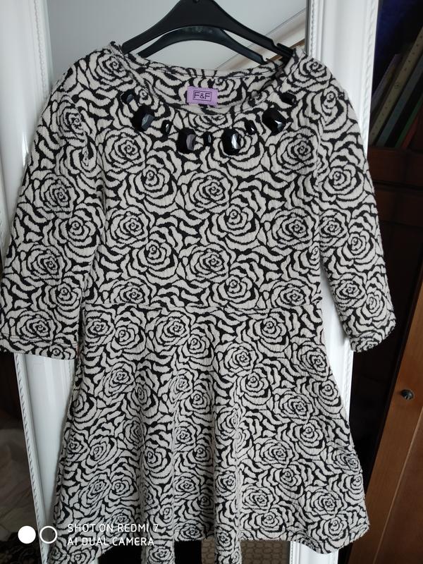 Платье из плотной ткани фирмы F&F. на возраст 5-6 лет, рост 110-116 см. Замеры: полуобхват груди 32 см от плеча до талии 25 см от талии до низа 35 см общая длина 60 см