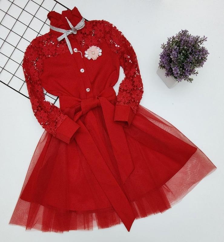 Шикарное платье с дорогим кружевом 🧁с юбкой из фатина в два слоя в реальности очень крутое!!!! на рукавах манжеты застегиваются на пуговки 🧁воротничок стойка с красивой тесьмой 🧁материал- костюмка, кружево, фатин пуговки на платье с камушками переливаются очень красиво 🧁брошка съёмная( может отличаться) КАЧЕСТВО СУПЕР!!!! размер/🧁длина(без фатиновой юбки)/пог/рукав 122/🧁68/33/45-1шт 146/🧁79/38/54-1шт