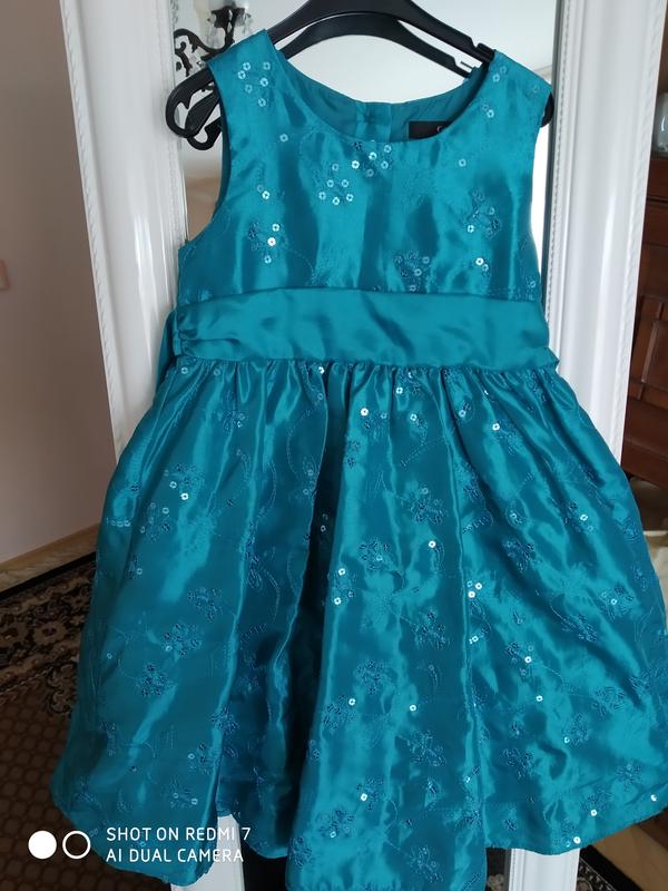 Платье изумрудного цвета фирмы George на возраст 3-4 года, рост 98-104 см, на спинке пуговицы., пояс завязывается и подчеркивает талию, расшитая пайетками и вышивкой. Замеры: полуобхват груди 30 см от плеча до талии 20, 5 см от талии до низа 42, 5 см общая длина 63 см