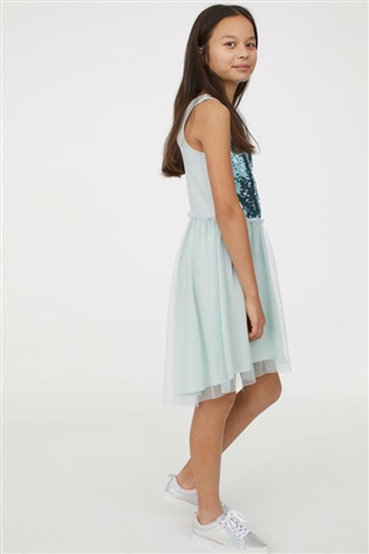Нарядное платье H&M на 12-14 лет на р.164. Платье без рукавов из мягкого трикотажа с добавлением вискозы с двусторонними пайетками спереди. Присборенный шов на талии и юбка из тюля на подкладке. Состав. Верх: полиэстер 76%, вискоза 19%, спандекс 5%. Нижняя часть: 100% полиэстер. Подкладка: 100% полиэстер. длина - 90 см, длина по спинке - 100 см, ПОГ - 38 см, ПОТ - 34 см.