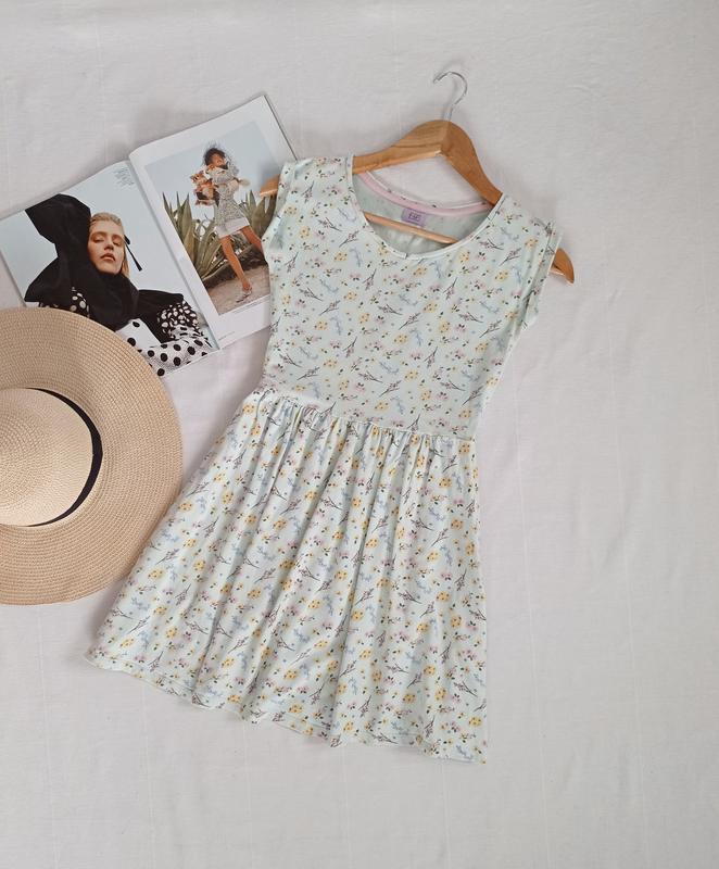 літнє плаття для дівчинки в ніжно м'ятному кольорі з квітковим принтом від F&F, тканина трикотаж добре тягнеться, розмір вказано на 12років, ПО грудей 36 см ширина поясу 34 см довжина 78 см