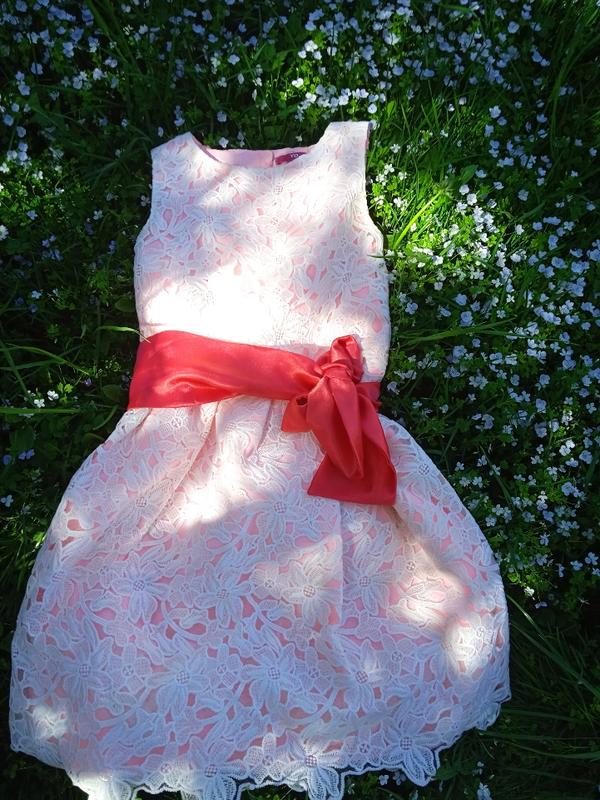платтячко має знизу коралову підкладку, зверху білий гіпюр. довжина виробу 80 см, пот 35 см. вік 10-11 років