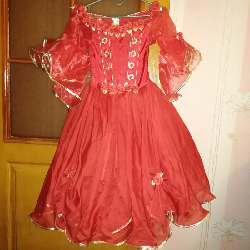 Нарядное платье. На девочку лет 6. Покупали дочери на выпускной в садик. Красивая пышная юбка. Верх сделан корсетом. На спинке замочек и затягивается по размеру шнуровкой. Есть недостаток - отсутствует цветочек впереди на корсете (последнее фото).