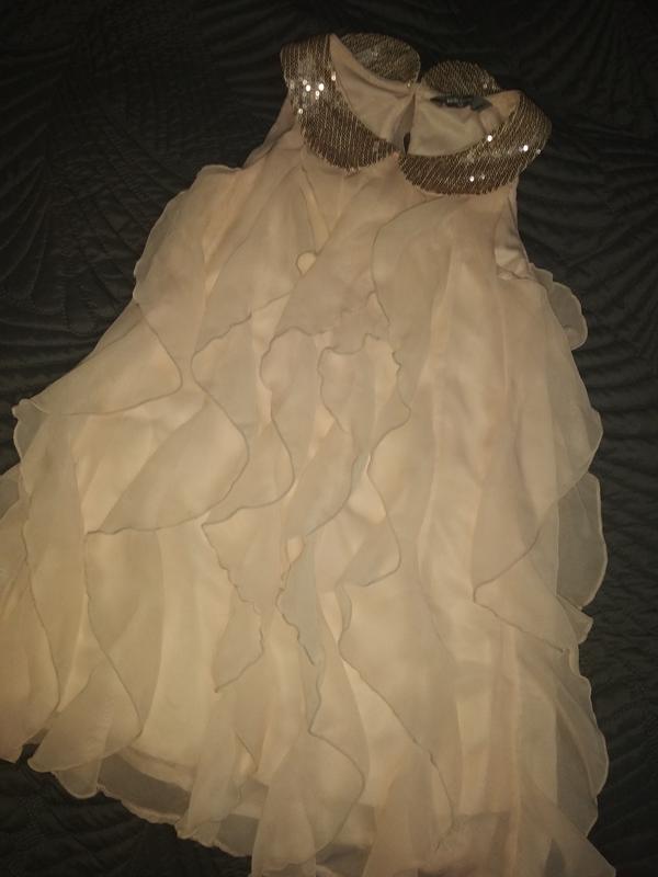 в новом состояние, за исключением по спинке порвано по длине выреза, не видно, легко исправимо, не пятен не других дефектов, эффект огонь, все расшито воланами, цвет бежевая пудра, паетка на воротничке, Пог 30, длина 55