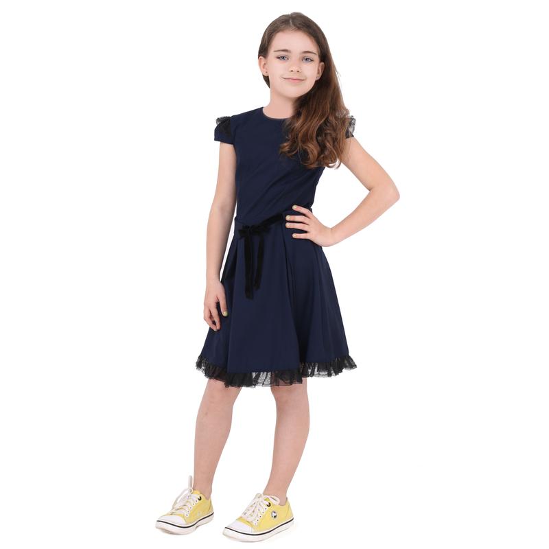 Состав: 100% полиамид. Модель довольно сдержанная и, одновременно, привлекающая к себе внимание окружающих с круглым вырезом горловины и приталенным силуэтом. В комплект входит лаконичный тканевый пояс с бархатными завязками. Придает миловидности черное кружево в виде оборки по низу юбки и по плечевому шву коротких рукавов - фонариков. На спине платье застегивается на потайную молнию. Размеры: 116, 122