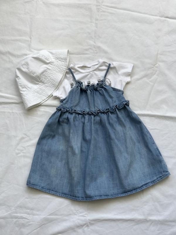 Красивый качественный джинсовый сарафан фирмы Next на бретельках в очень хорошем состоянии. Можно носить как на футболки так и самостоятельно. Доя лета и в жару идеальный вариант. Ткань не плотная, но форму держит. Панама H&M в подарок. Размер на рост 92 см.