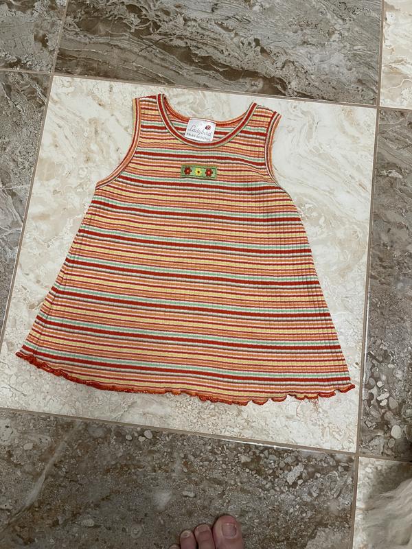 Яркое летнее трикотажное платье на девочку 18/24месяца с ярким принтом в модную полоску.Чистое,без пятен,без катышек,состояние идеальное.Длина изделия-41см,ширина брительки-5,5см,под руками-31см.