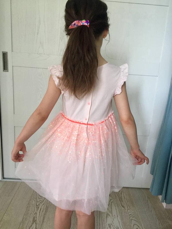 Пышное платье Next с единорогом от бренда Next. Пышная двойная фатиновая юбка с пайетками+ ещё третий слой фатина и + хлопковая подкладка делают платье нарядным и воздушным. Спереди украшено аппликацией единорога. Сзади на пуговицах. Верхняя часть из хлопка{ футболочый трикотаж}. Размер указан 6-7 лет, 122 см, на фото одето на 7 лет. Замеры: плечи 28 см по груди 32 см по талии 33 см длина по центру спины 63 см длина от плеча 66 см. Состав: на фото. Нюанс: дырочка над юбкой, под единорогом.