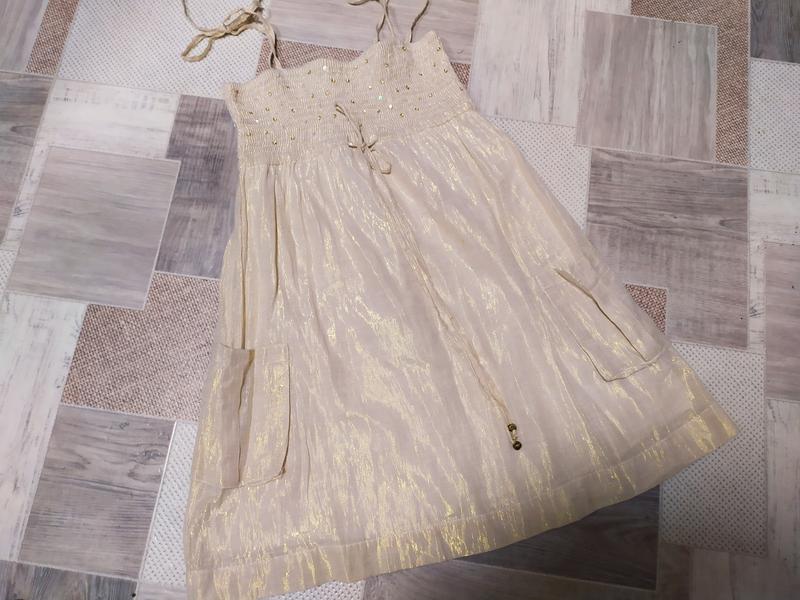 красивый сарафанчик для девочки .на возраст 10-13 лет брители на завязках .верх на резинке .по бокам карманы .цвет жёлтое золото .на подкладке .почта любая