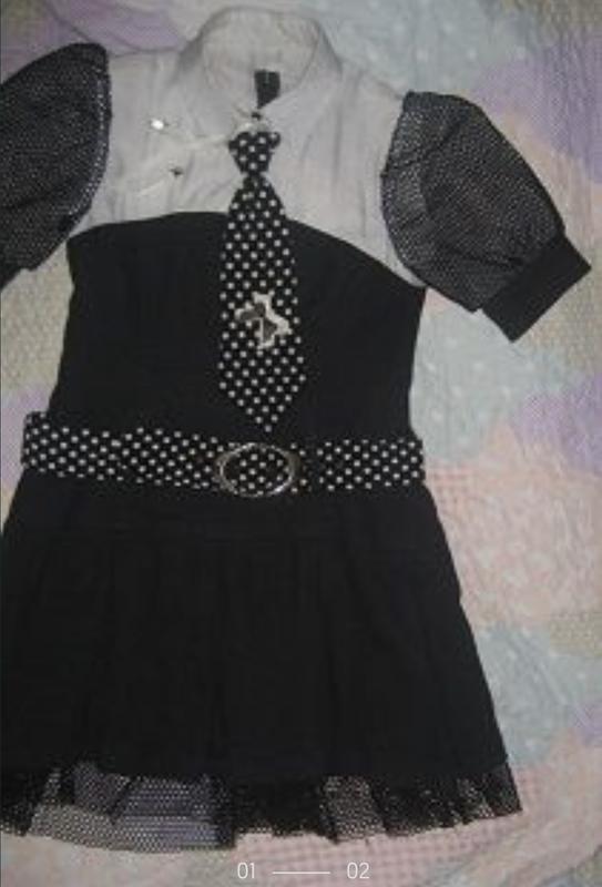 Платье из нескольких видов ткани, сетки темно синей и белой, лиф из белого ацетатного шелка , низ темно синий, складка бантовая. Галстук снимается , впереди на 3 пуговках, сзади на молнии . Ремень с пряжкой, снимается, можно носить без него. очень красивое демисезонное школьное платье,школьный сарафан, второго такого не будет ни у кого. На рост от 140 до 150.